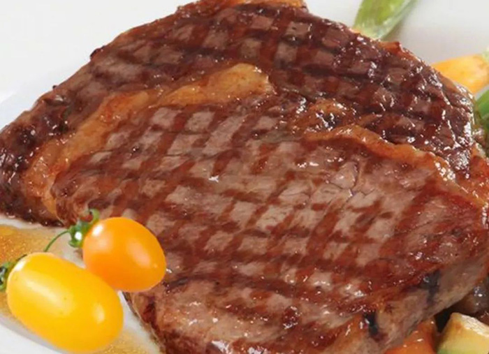 西冷牛排取自牛的上腰部位,屬于牛外脊肉。西冷牛排肉質(zhì)比較厚,脂肪含量比菲力牛排高,帶有大理石花紋,纖維略粗,有一定的結締組織和筋膜,彈性比較好。在肉的外延帶有一條白色肉筋。