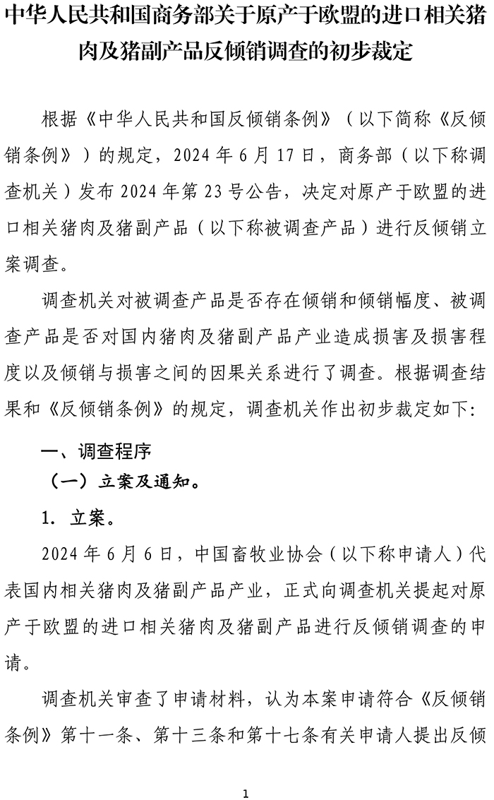?中華人民共和國商務部關于原產(chǎn)于歐盟的進口相關豬 肉及豬副產(chǎn)品反傾銷調(diào)查的初步裁定